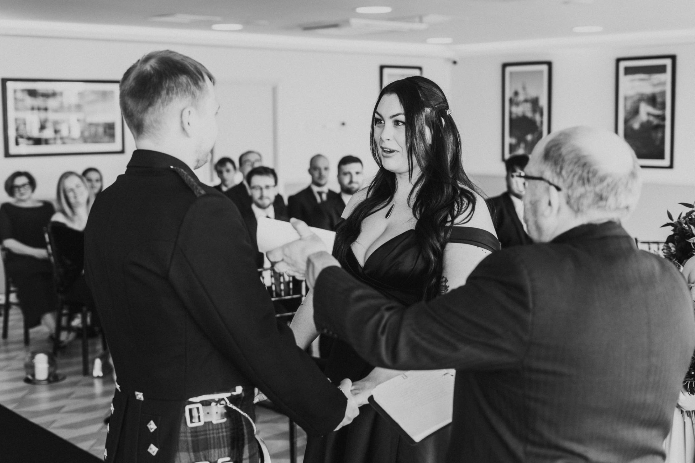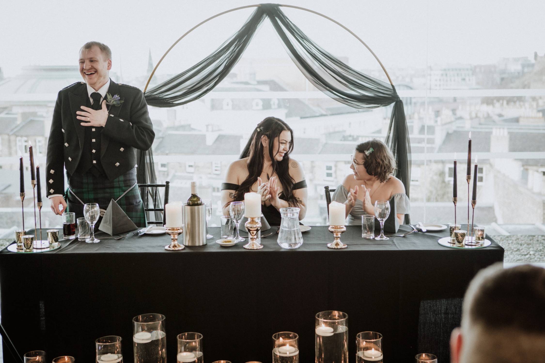 Set high above the city, SKYbar Edinburgh provided a private and cinematic backdrop for their day. The panoramic views over Edinburgh created a sense of space and drama, while the exclusivity of the venue allowed the celebration to remain intimate and personal. Surrounded by their closest people, Brittany and Finlay exchanged vows in a setting that felt both elevated and grounded—modern yet deeply emotional.